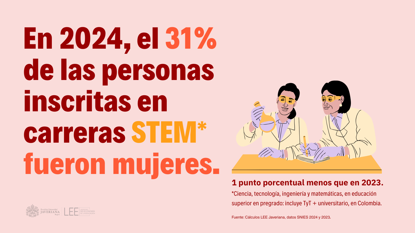 • En 2024 en Colombia, el 31% de las personas inscritas en carreras STEM (Ciencia, tecnología, ingeniería y matemáticas) fueron mujeres, un punto porcentual menos que en 2023. (SNIES, 2024).