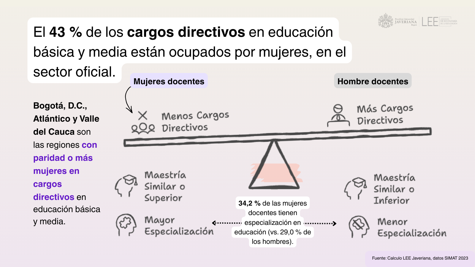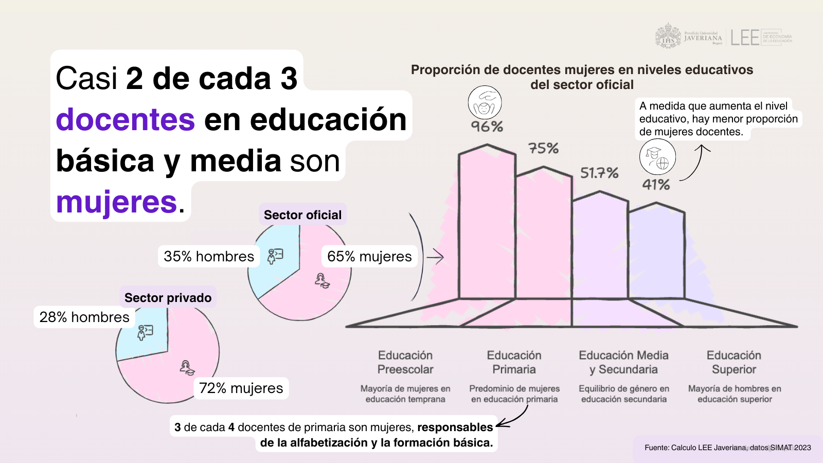 Bogotá, 8 de marzo 2026 (@LEEJaveriana). Un análisis del Laboratorio de Economía de la Educación (LEE) de la Pontificia Universidad Javeriana, elaborado con datos del Sistema Integrado de Matrícula (SIMAT) y del Sistema Nacional de Información de la Educación Superior (SNIES), examina la participación de las mujeres en la docencia y su papel en la formación de estudiantes en el país.